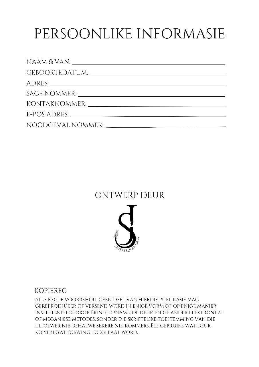 Size A5, available in Afrikaans and English, hard front and back cover, twist binding, quarterly sections (tabs).
