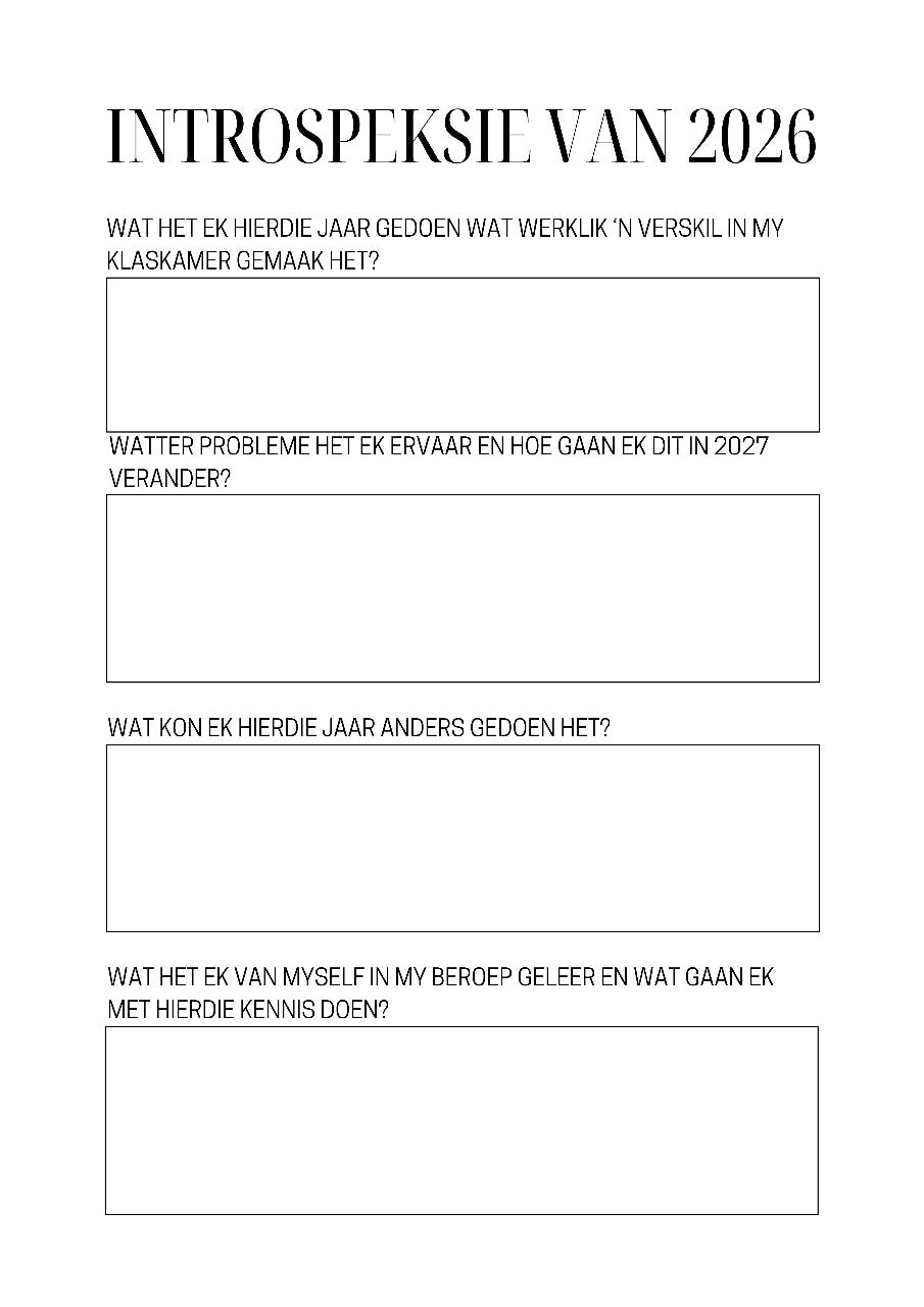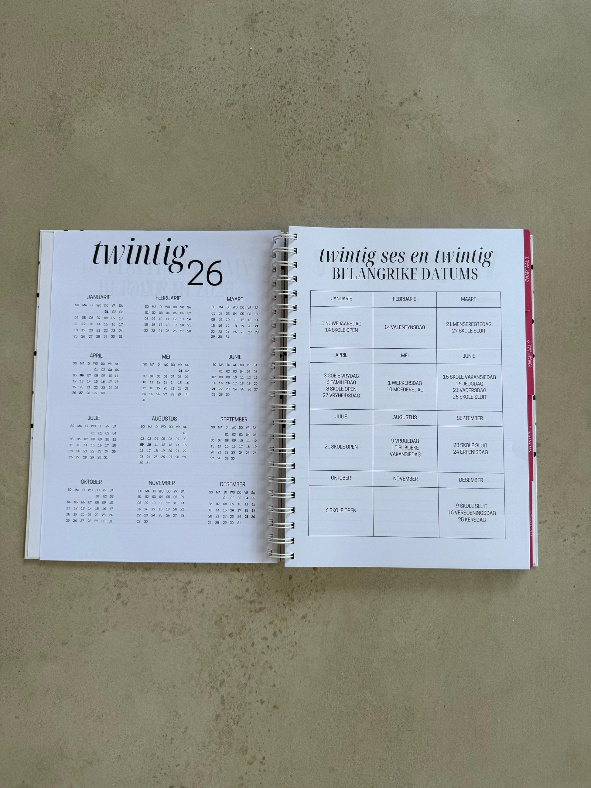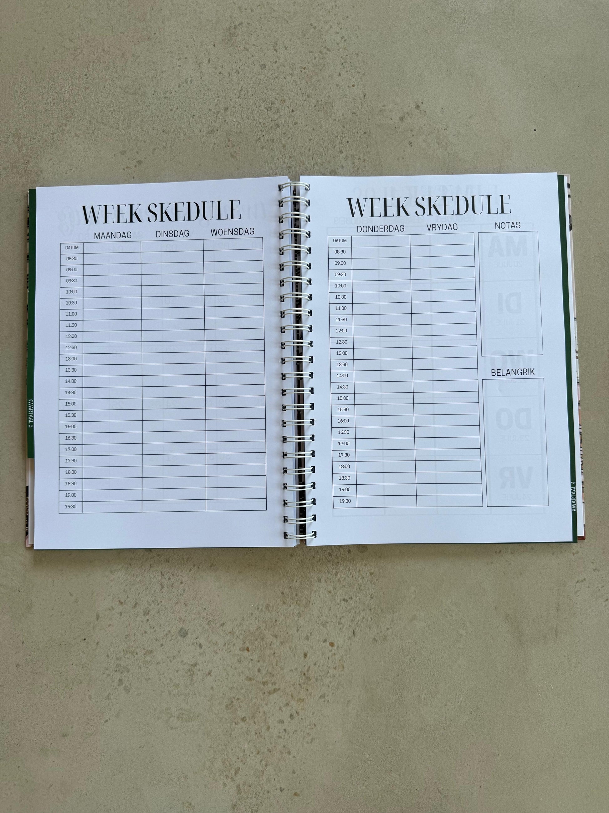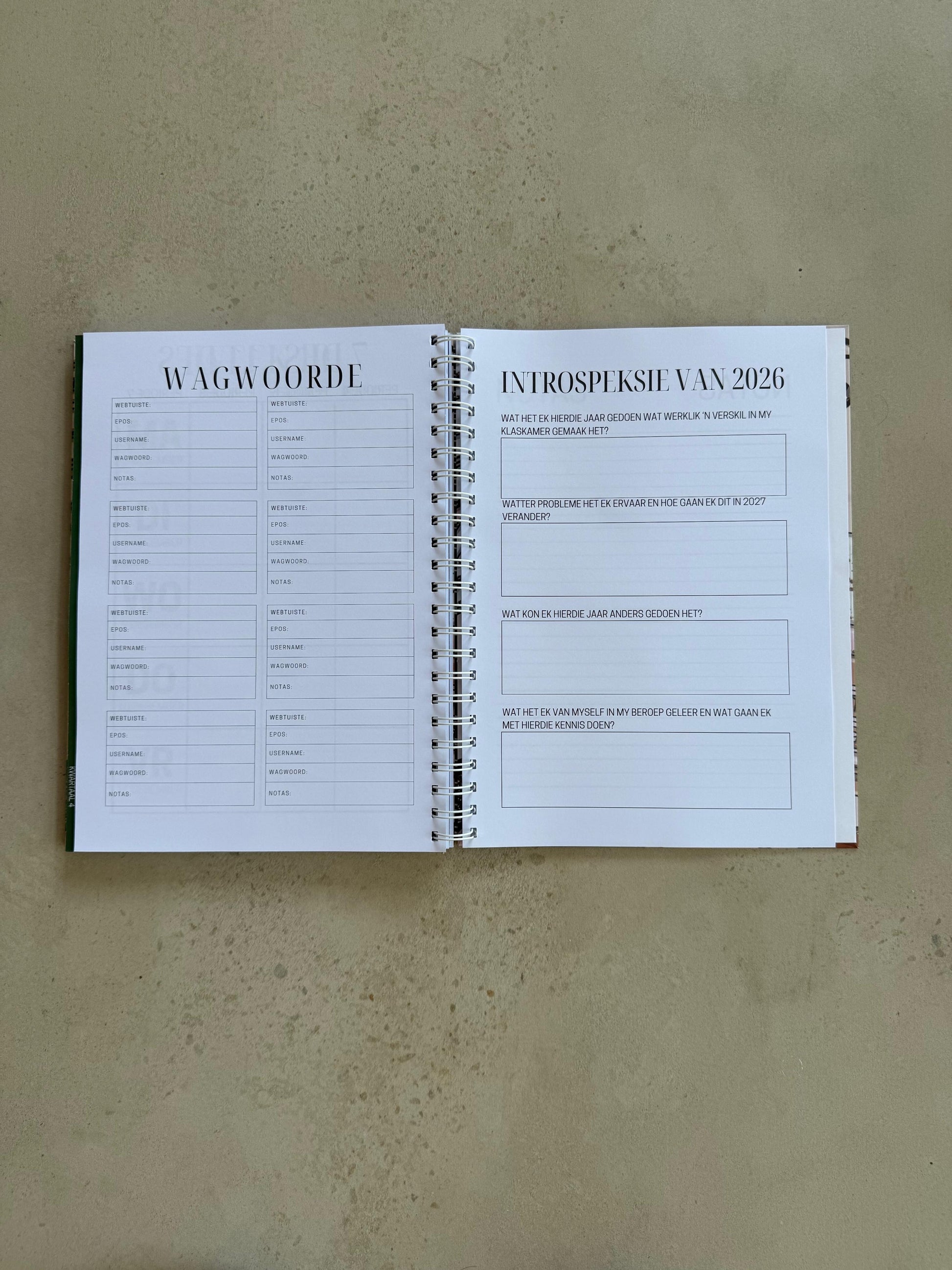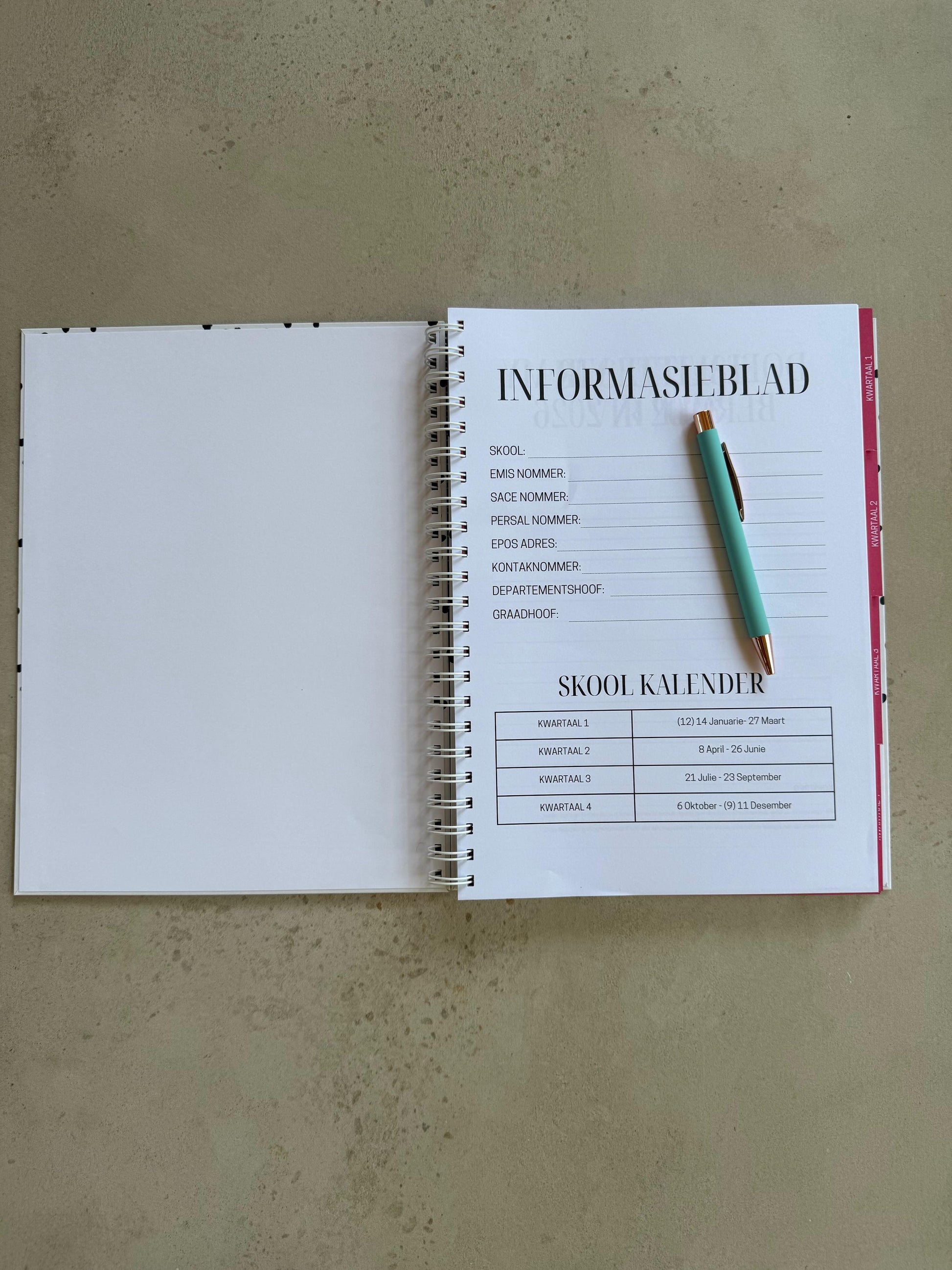 Size A4, available in Afrikaans and English, 6, 7 or 11 periods, hard front and back cover, spiral binding, quarterly sections (tabs).